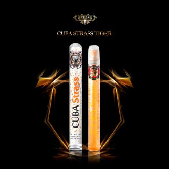 CUBA STRASS TIGER FOR WOMEN comes in its iconic cigar-shaped bottle, with a dazzling twist: the golden juice is infused with glitter, leaving your skin subtly sparkling after each spray. It opens with a lively citrus and aromatic floral burst, leading into a fresh spicy heart full of feminine floral nuances and soft white petals. The base lingers with a smooth blend of woody and musky notes that balance radiance and sensuality.