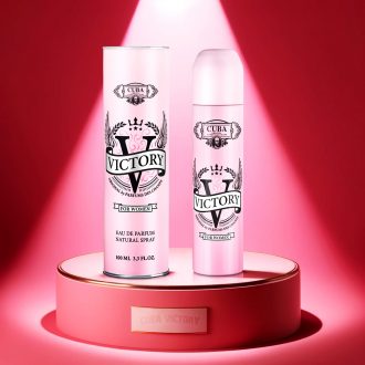 CUBA VICTORY FOR WOMEN is presented in its iconic 100ml cigar-shaped bottle with a bold pink design that symbolizes strength and elegance. The fragrance opens with a vibrant burst of fruity and citrus notes, lightly tinged with a nutty undertone for a surprising twist. At the heart, green accords blend with jasmine, violet, and marine notes, evoking freedom and natural charm. The base settles into a comforting trail of musky vanilla and warm amber that lingers beautifully on the skin.