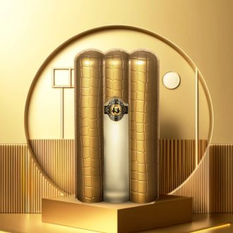 Presented in a sleek box with a crocodile-skin design, this set reflects masculine prestige and confidence. Each fragrance is marked by a label ring in unique shades (black, gold, blue, brown), evoking timeless elegance and character.
