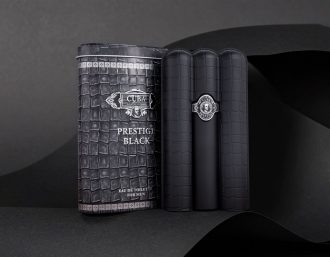 CUBA PRESTIGE BLACK FOR MEN comes in the brand’s signature cigar-shaped bottle, wrapped in a bold black crocodile-textured casing. It opens with crisp citrus and woody freshness, creating an invigorating start. The heart unfolds with aromatic greens and delicate white florals that balance power and refinement. A deep base of mossy woods, golden amber, and sensual musk completes the scent with lasting warmth.