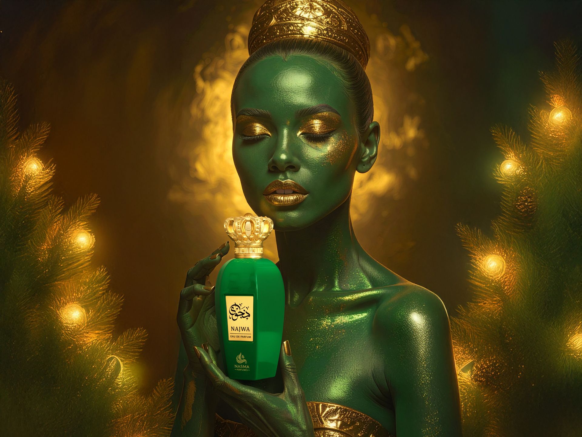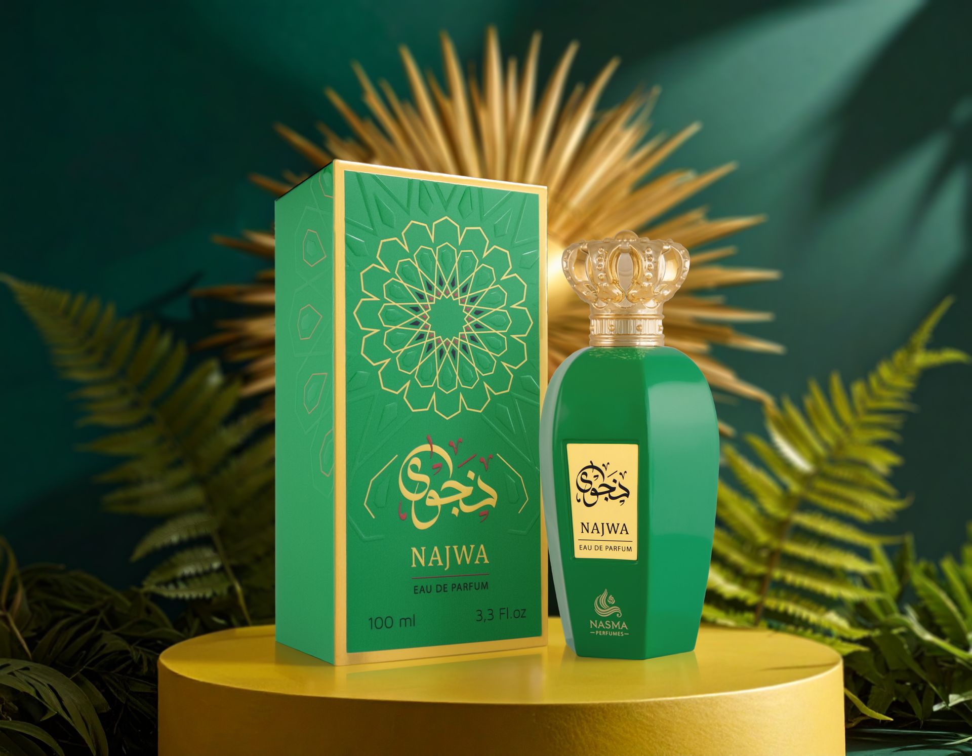 NAJWA FOR WOMEN by NASMA comes in a luxurious emerald green bottle crowned with a golden cap, reflecting the perfume’s bold and regal spirit. It opens with juicy tropical and fruity top notes that instantly uplift the senses. The heart reveals a sweet green floral bouquet that adds charm and femininity. Finally, warm amber and woody base notes wrap the fragrance in a comforting yet elegant finish.