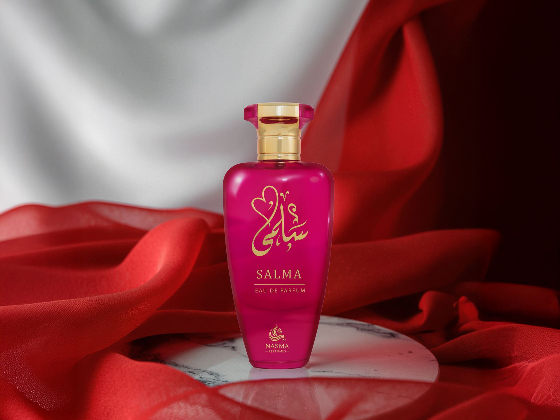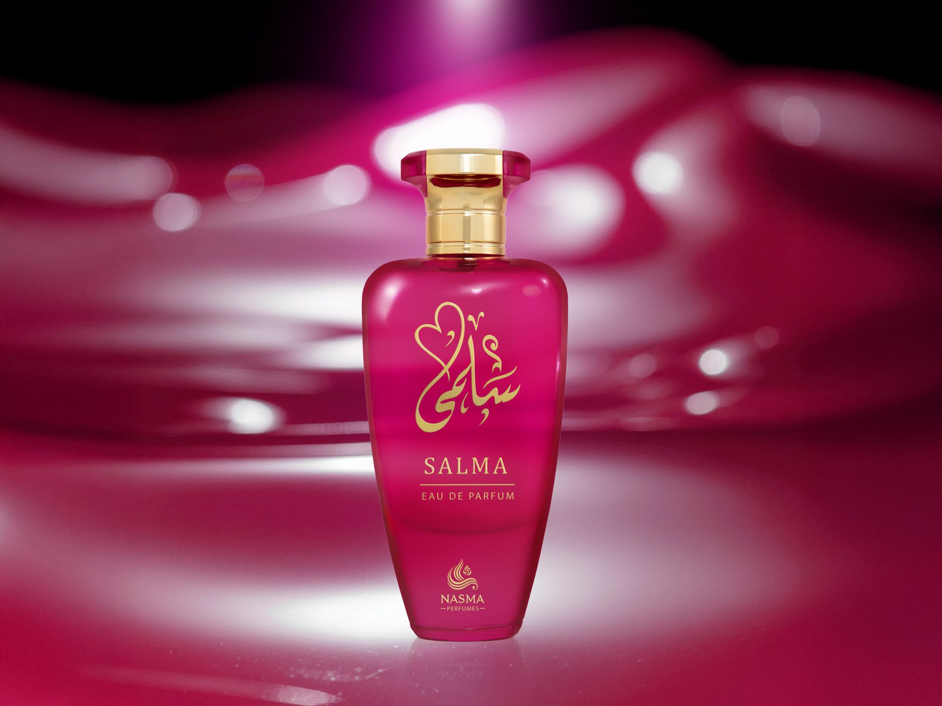 SALMA FOR WOMEN by NASMA is presented in a striking magenta bottle with golden accents and heart-shaped Arabic calligraphy, a true symbol of elegance and passion. It opens with bright citrus and rich amber, creating a luminous and warm first impression. At the heart, romantic notes of rose and jasmine blend with a touch of sweetness, evoking grace and sensuality. The fragrance finishes with a gourmand base of vanilla, smooth chocolate, and earthy patchouli, leaving a seductive and comforting trail.